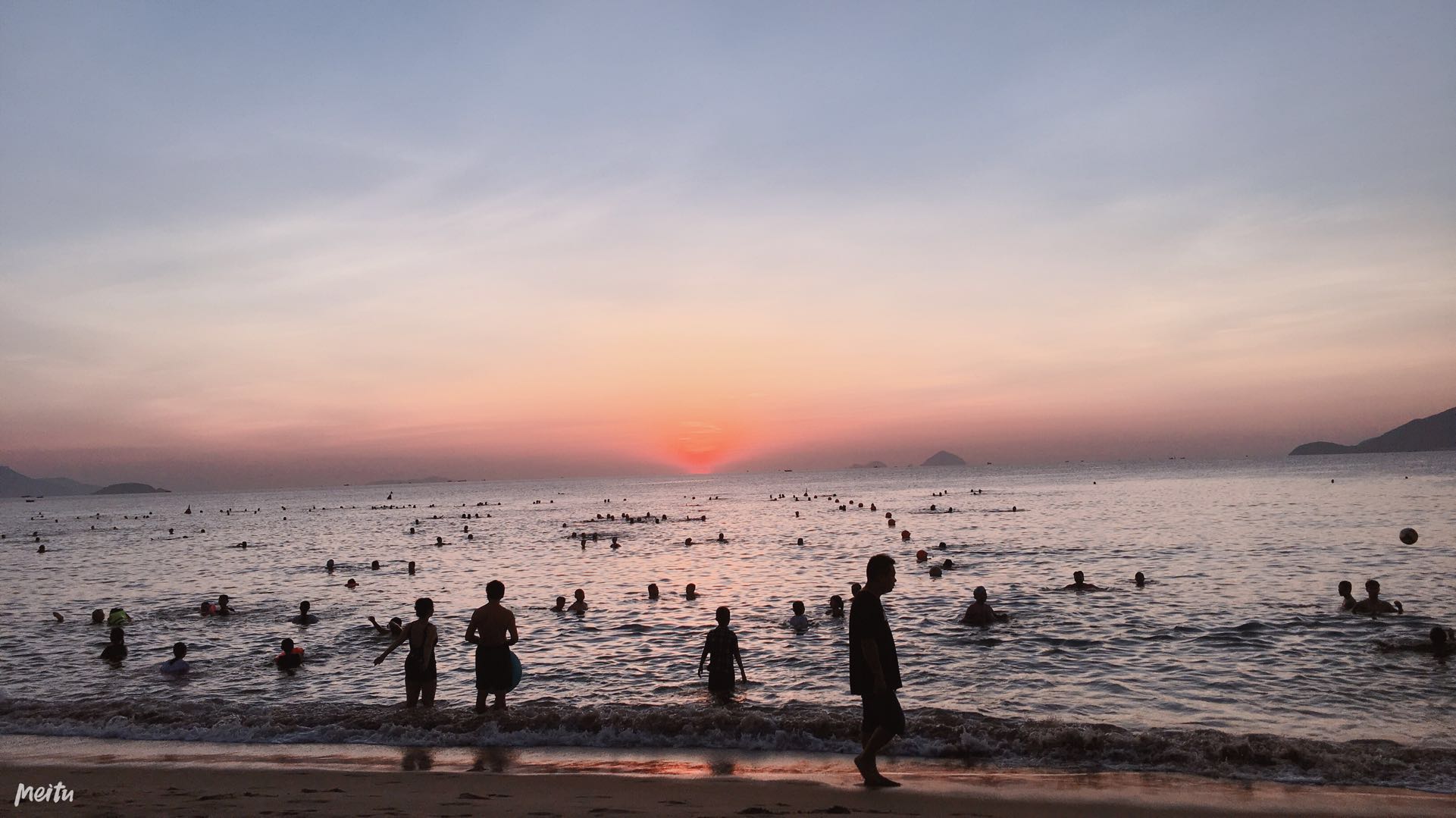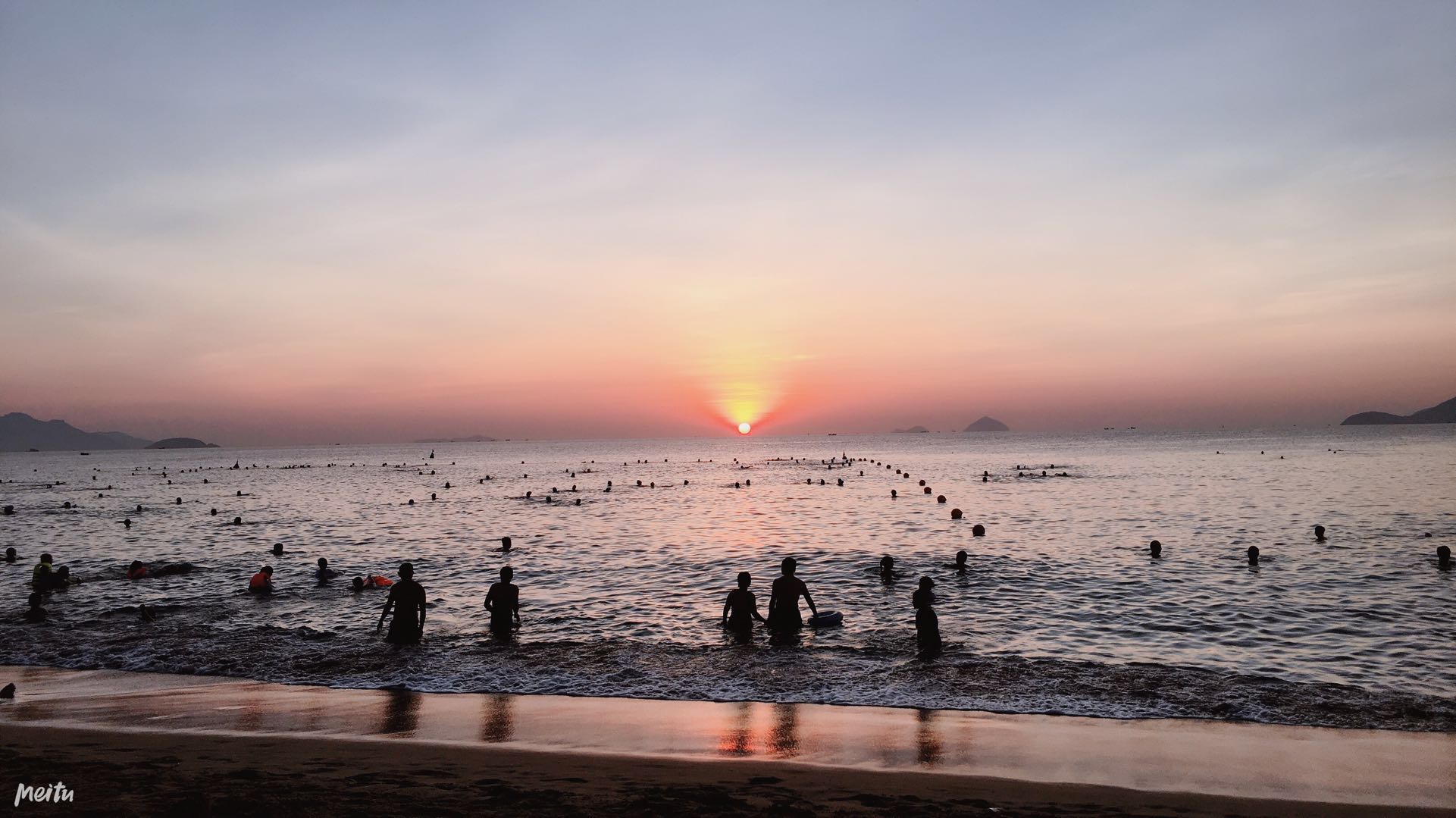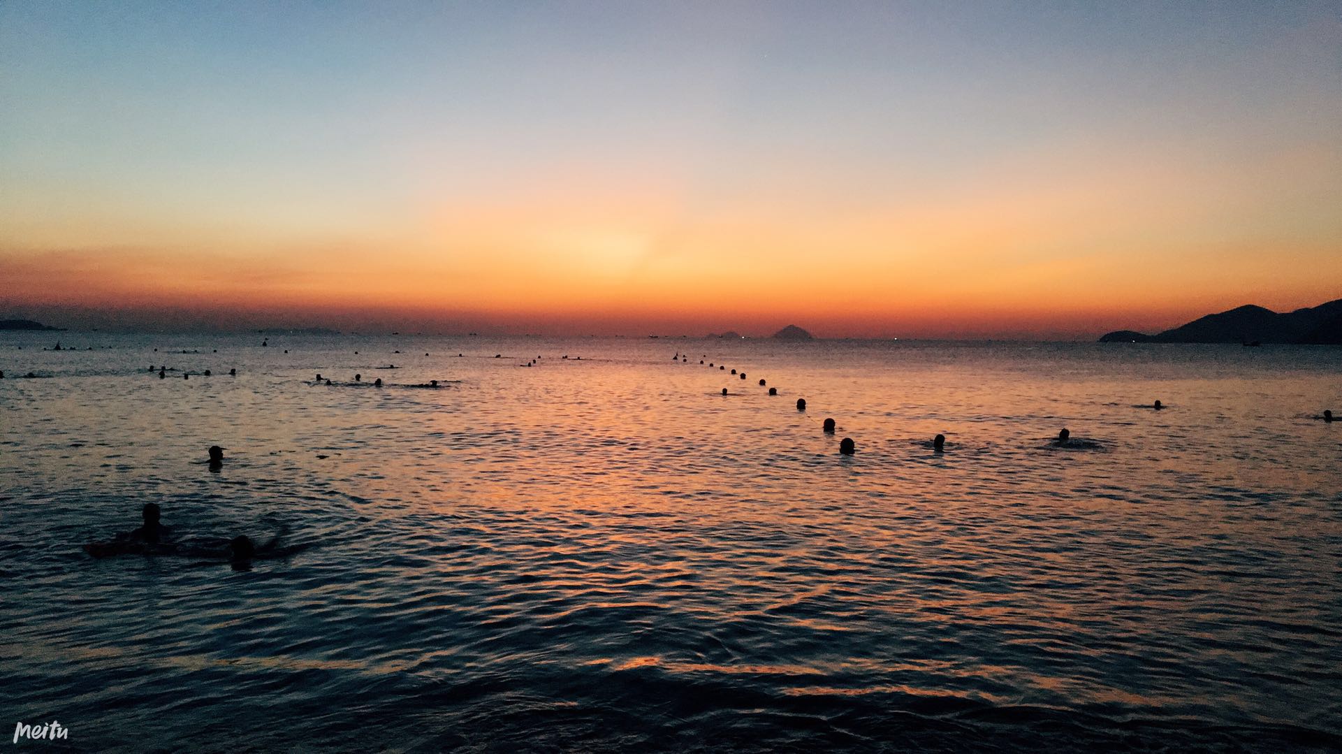 来到沙滩,微微的光看到海平面上有好多的头,真想为他们点一个赞,晨泳的人这么多,本以为我起得够早,却发现比我早的人还太多。找到沙滩上一处坐下,眼睛一眨不眨的看着远处的海平面,生怕错过了日出升起的那刻。海水微微的荡着,天稍稍的见亮,海平面最远处呈现出一道弱弱的光。