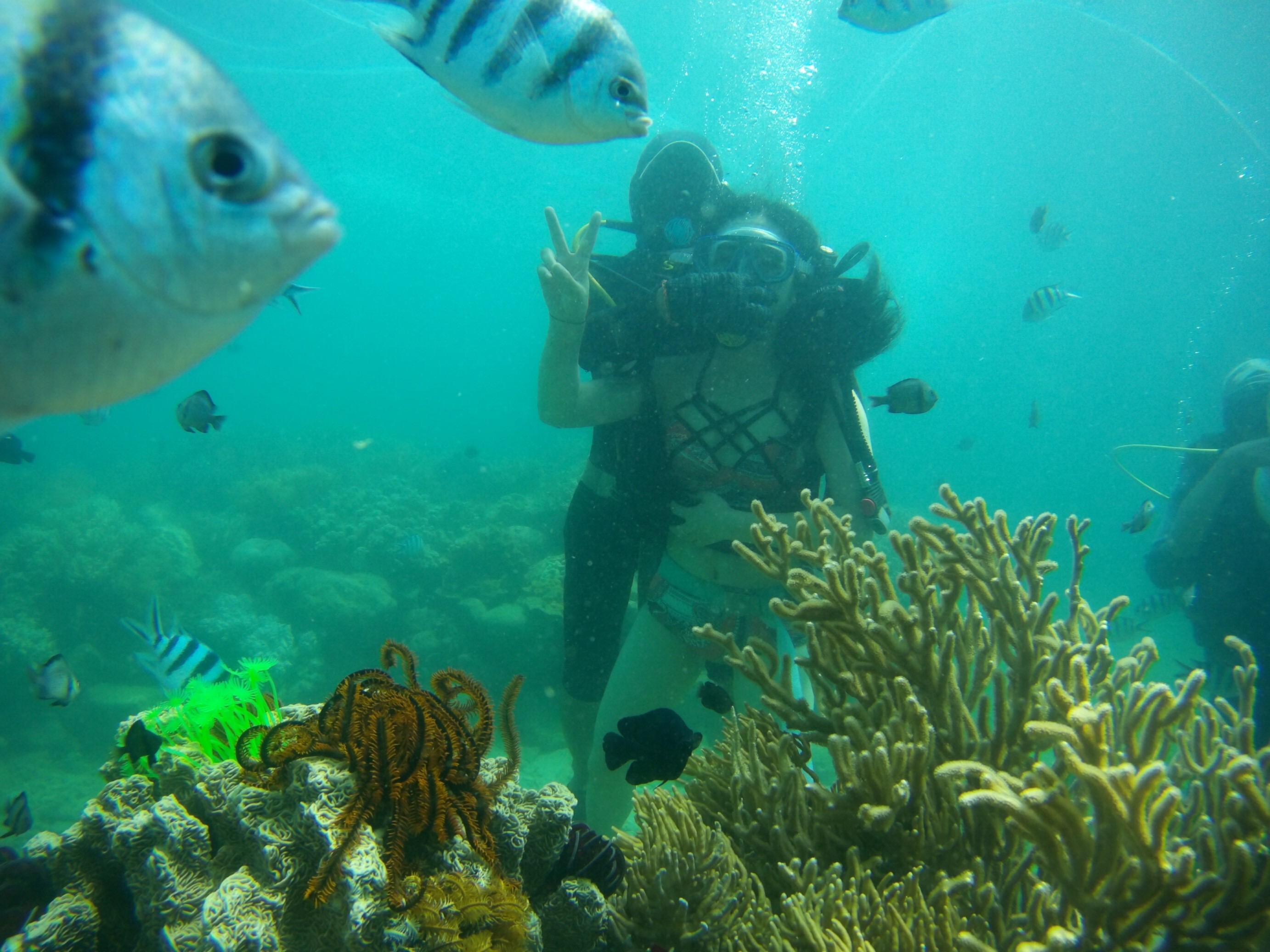 教练带着我往下,潜入海底,也许一切美好的遇见都要在风雨后。百闻不如一见,以前听说海底景色如何美不胜收,这次亲自浮潜,果然名不虚传,海水清澈见底,看着品种繁多的海洋鱼类游梭于珊瑚礁的周围,然后游向我时,感觉鱼儿们在优雅的欢迎我进入它们的世界,我立刻伸出了自己的手,觉得可以和它们握手,和它们共舞;看着珊瑚在海水中翩翩然,似乎刚刚是鱼儿对它们饶痒痒,它们在说,好痒、好痒……
